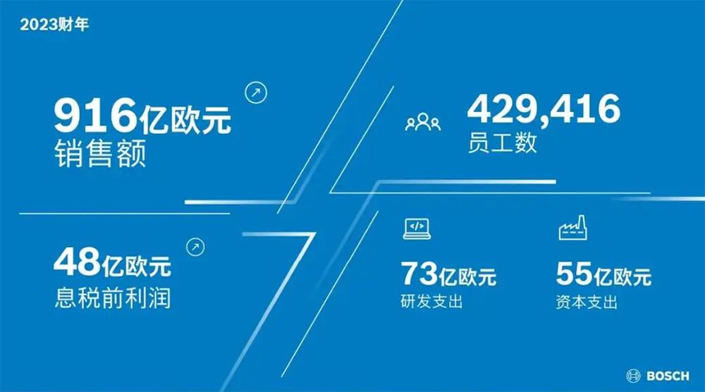 博世在2022年实现了882亿欧元的销售额(约6827亿人民币),同比增长12%。;息税前利润达到38亿欧元(约294亿人民币),息税前利润从4%上升到4.3%。
