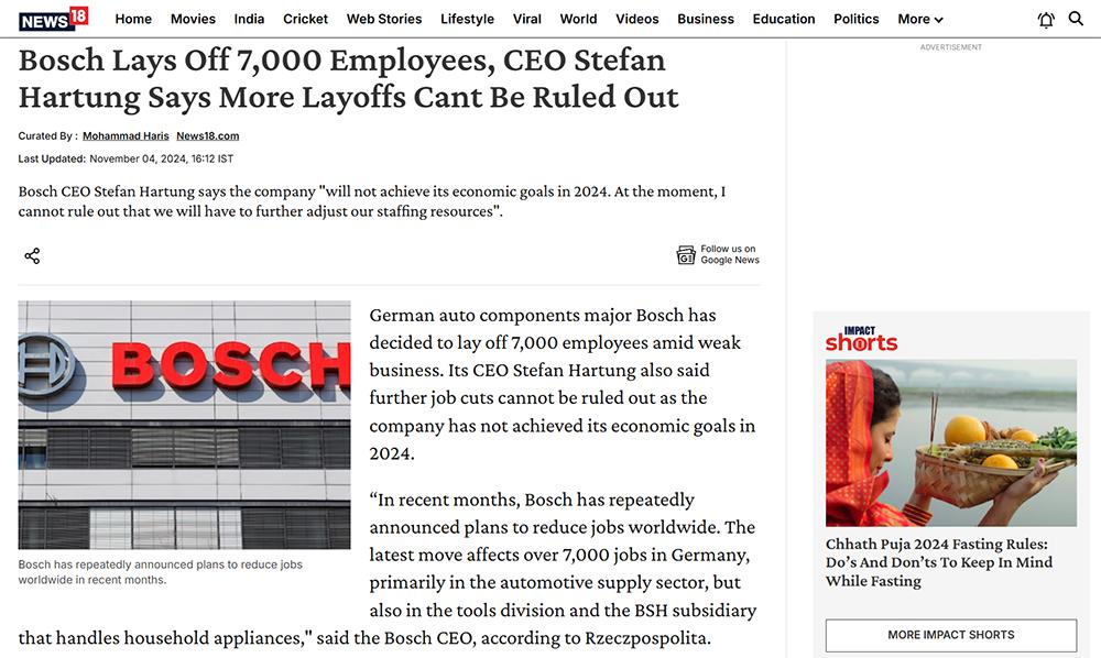 在过去的一年里,博世集团至少三次宣布了大规模裁员计划,这并不是第一次进行人员调整。