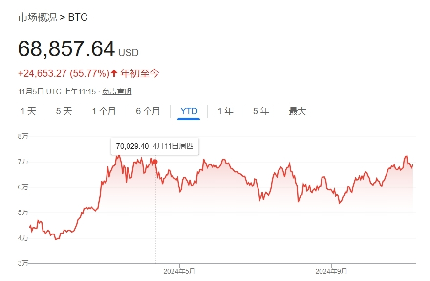今年以来,比特币市场上涨了近60%,同期表现优于股票、黄金等资产。今年3月,在资金流入美国ETF的推动下,BTC一度达到73798美元的历史新高。