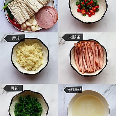 1、金针菇洗净去根,掰成小块,用热水浸泡粉丝。准备蒜末、葱花、小米椒和火腿条。调一碗酱(一勺酱油,一勺油耗,少量糖,少许盐和少量水)