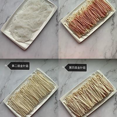 2、第一层放泡好的粉丝,第二层放金针菇,第三层放纵火腿,第四层放金针菇。
