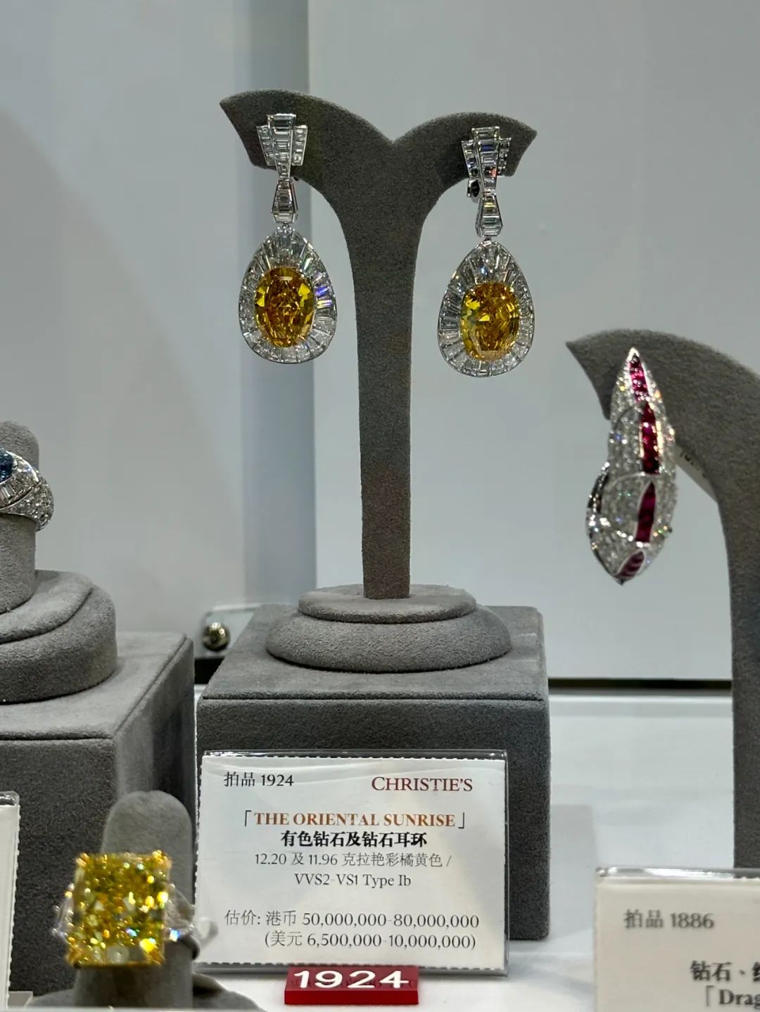 今年的“拍王”是一对名叫“拍王”The Oriental Sunrise"钻石耳环,各自镶嵌12.20克拉和11.96克拉彩色橙色裸钻。