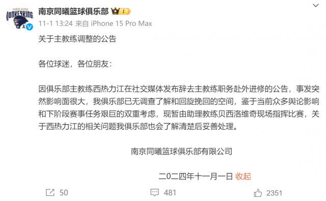 同曦官方宣布:由助教贝西洛维奇指挥比赛。同曦老板对西热力江的两项工作不满:一是引进了不合格的外援,二是同曦球员的态度出了问题。据媒体报道,同曦与外援签约的资金有限,因此他们很难承担失败的后果。