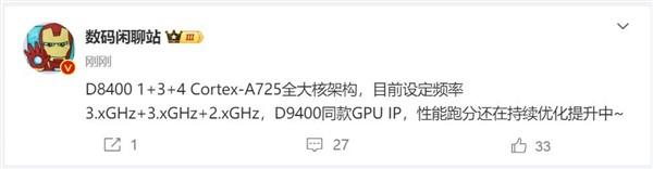MTK天玑 8400 基于台积电的参数配置曝光 4nm 工艺制造,以高通骁龙为目标。 8 系统旗舰平台。据悉,天玑 8400 选用 Cortex-A725 全核结构模式,CPU 主频率最高突破 天玑集成了3GHz。 9400 同款 GPU IP(天玑 9400 的 GPU 是 GPU 是 Immortalis-G925 MC12)。