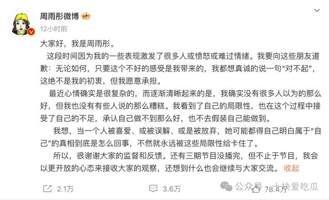 虽然人不是圣贤,但短短几集节目就出现了这么多问题,预计外观不好。目前周雨彤的微博评论区已经被网友“冲”了,感觉人气很难恢复。