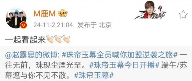 鹿晗同为分享赵露思动态,加了一句:“一起看”!