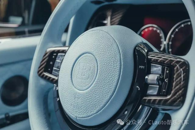 内饰部分,显示出这款车被称为“” Blue Sky 原因,因为它采用了天蓝色拼接皮革,其它细节也包含了很多其它细节。 Brabus 标志、碳纤维装饰和灰色装饰。此外,还可以看到铝踏板、灯光门槛板和定制的星空屋顶,屋顶上还有拼接的贝壳图案。