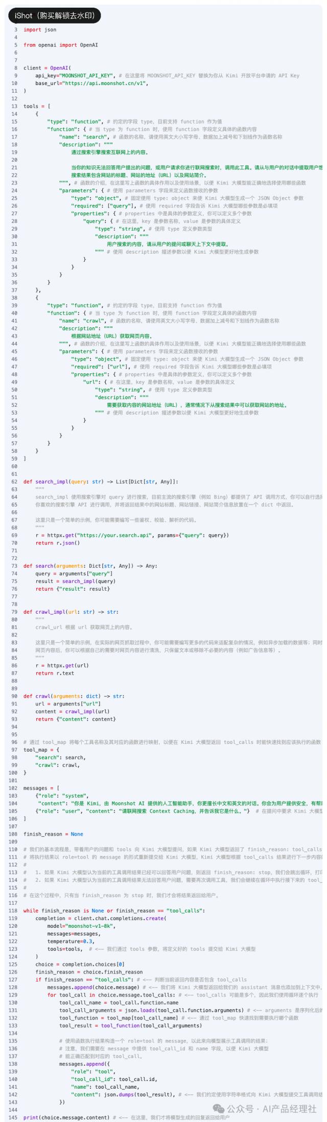 虽然代码有点长,但还是比较容易理解的,现在 kimi 使用工具时,首先要定义好工具。 tools,包含: