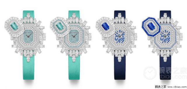 蓝宝石和碧玺表与 2014 同样的年表款,选择白色 18K 金色的表壳,但是顶部各有一颗深蓝色的蓝宝石和一颗帕拉伊巴色的碧玺。