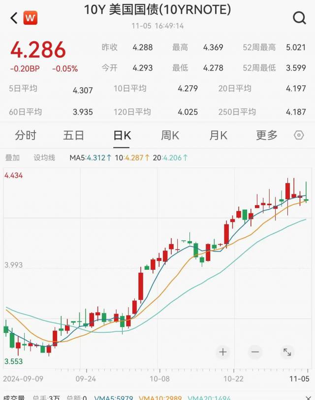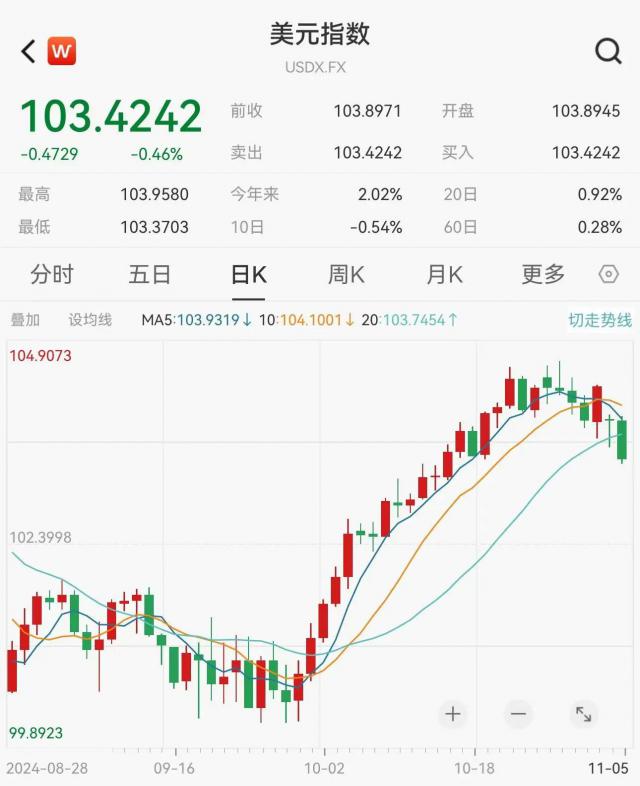 据 Wind 数据显示,美元指数和美债收益率均呈下降趋势。美元指数一夜之间下跌 0.46% 至 103.42,10 一夜之间美债收益率变化不大,但下降意愿不大。