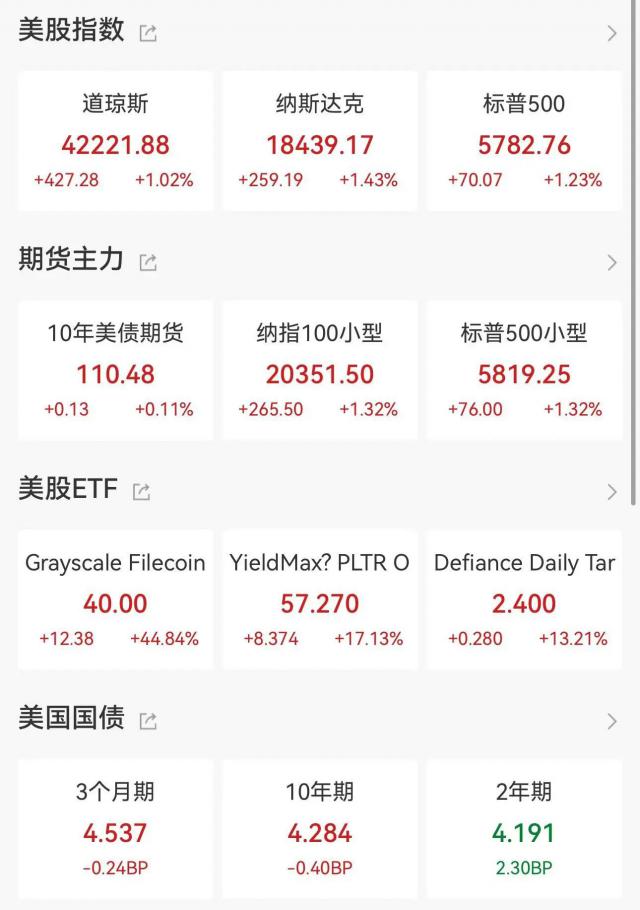 该指数上涨 1.23%,收在 5,782.76 点。纳斯达克综合指数上涨 1.43%,至 18,439.17 点。道琼斯工业指数上涨。 427.28 点,收在 42,221.88 点,涨幅 1.02%。