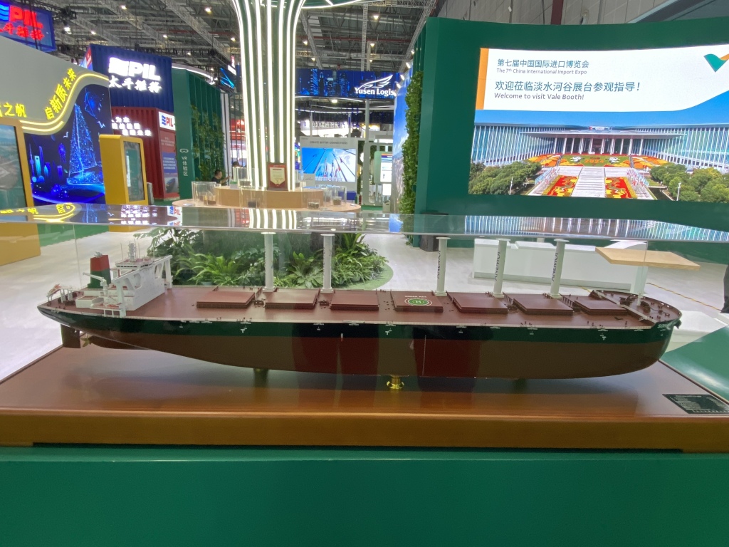 中国国际进口商品博览会开幕第一天,服务贸易展区也有很多亮点。淡水河谷展台上的一艘船是1。:由240比例制成的船模,其原型是全球最大的矿砂船配置风速推进系统。