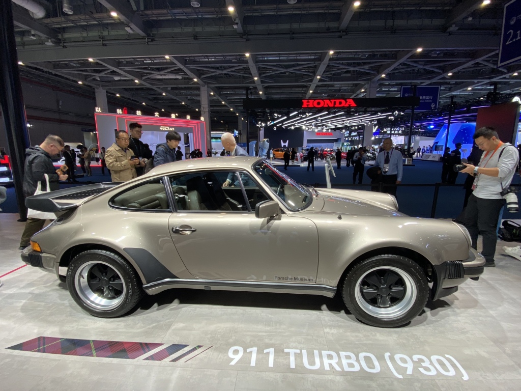 现场最引人注目的是保时捷第一次为中国公众带来了一款具有历史意义的经典车型——第一款量产911 Turbo(930)这款车专程从德国运往中国国际进口博览会,纪念Turbo诞生50周年,与保时捷中国旗下最年轻的纯电动Macan Turbo同场亮相。