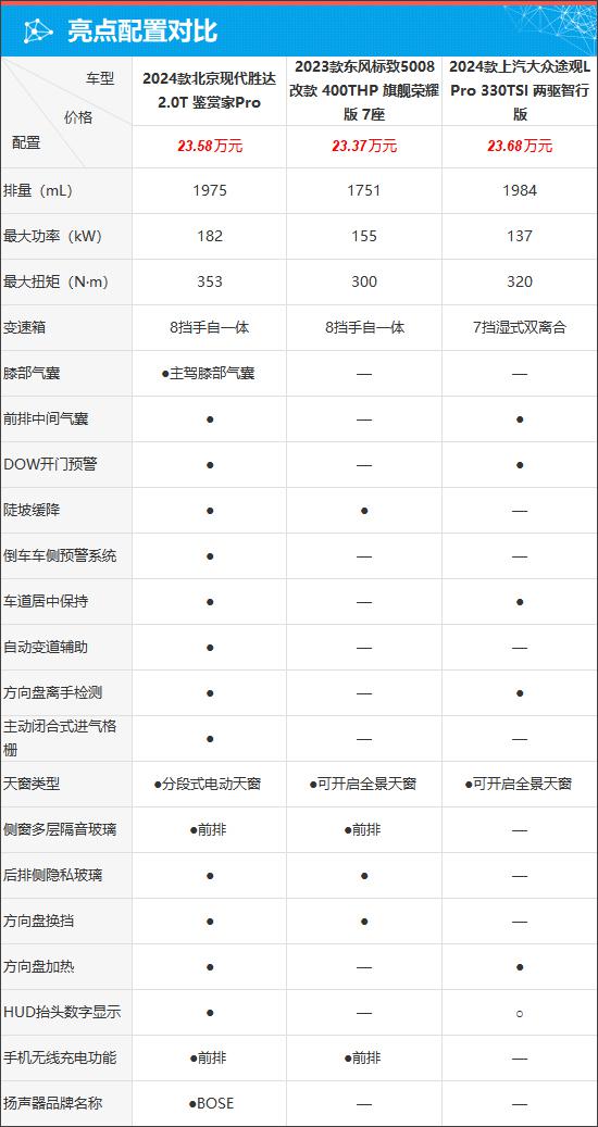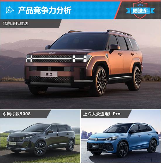 虽然现在我国新能源市场越来越火爆,但是仍然有很多消费者喜欢传统的燃油车,特别是在传统的燃油车中, 20 超过一万元的中型 SUV 市场。为了充分考虑价格和产品特性, 2024 北京现代胜达(以下简称胜达)选择了两个合资品牌的竞品车型,分别是 2023 款东风标致 5008(以下简称美丽 5008)和 2024 款式上汽大众途观 L Pro(以下简称途观 L Pro)。