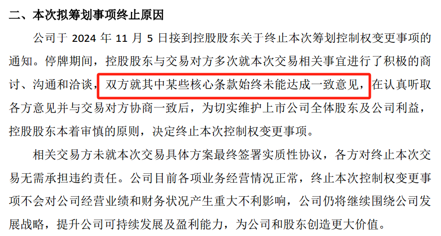 徐升集团宣布,在公司停牌期间,控股股东与交易对手多次就此次控制权变更事项进行协商, 但是双方一直没有就某些核心条款达成一致,决定终止此次控制权变更事项。
