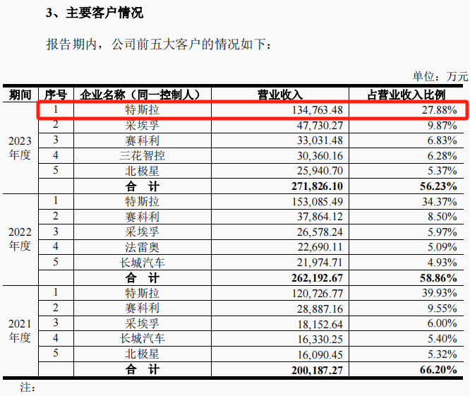 其中,徐升集团最大的客户是特斯拉。从2021年到2023年,特斯拉的营业收入分别占总营业收入的39.93%。、34.37%和27.88%。
