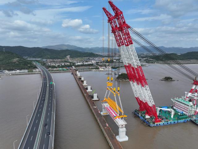城市铁路象山线跨海大桥总长 8.26 跨海段桥梁长度为公里 6.24 公里是中国第一座城市(郊区)铁路跨海大桥。预制箱梁共用梁在引桥段海上搭建 66 每一梁都长 60 米,宽 10.6 米,重约 1700 吨,是预应力混凝土预制箱梁,国内市(郊区)铁路工程跨度最大,吨数最重,方量最大。。