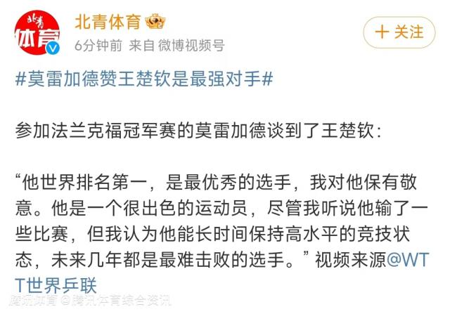 北京时间 11 月 5 日,参加 WTT 在接受媒体采访时,法兰克福冠军赛莫雷加德谈到了王楚钦,并称赞王楚钦是最好的球员。