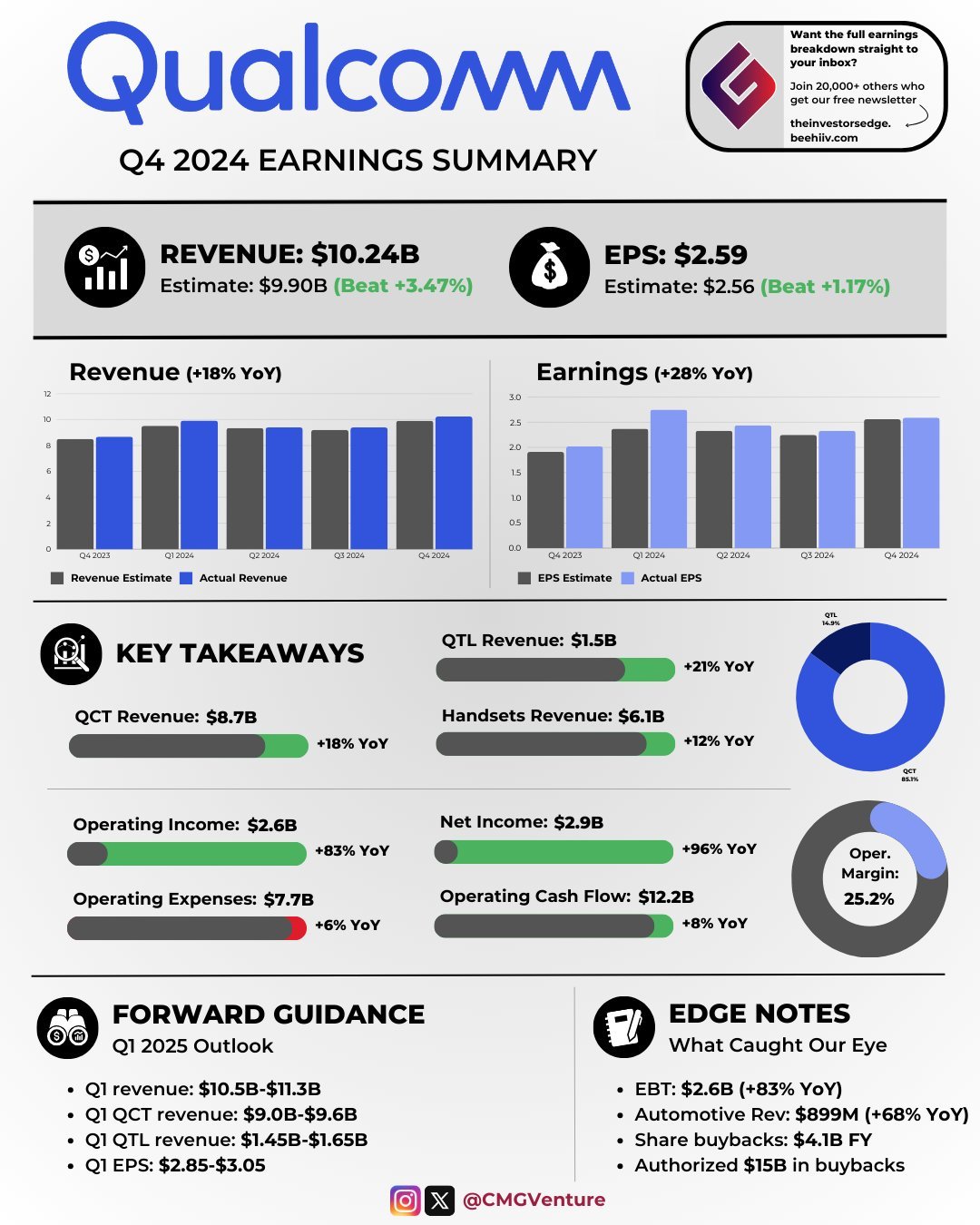 在美东时间11月6日周三美股市场之后,高通公布了2024财年第四财季(以下简称第三季度)财务数据,并提供了2024财年第一财季(以下简称第四季度)业绩指导,截至2024年12月底。2024财年第三财季称为第二季度。