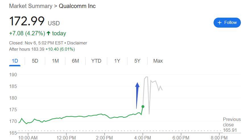 周三美股盘后财务报告公布后,收涨近4.3%的高通股价迅速上涨,盘后涨幅一度达到10%。