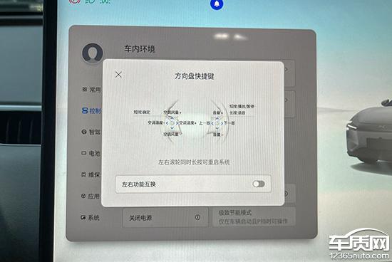 虽然方向盘上只有两个滚筒,但它们可以实现更多的功能。左滚筒可以支持风量和温度的调节,短按为“确定”功能;右滚筒可以支持音量和音乐调节,短按为“播放” / 暂停“功能”,长按为“语音”功能,初次上手需要时间适应。