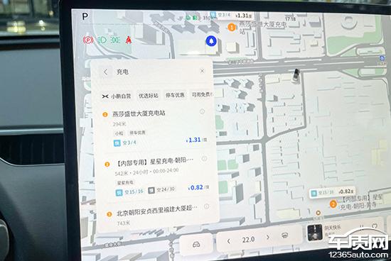 此外,和大多数纯电动汽车一样,地图还提供了一键搜索附近充电桩的功能,还会标注更方便的选项,如小鹏直营、优选站、停车优惠等。