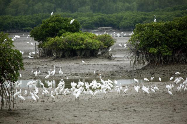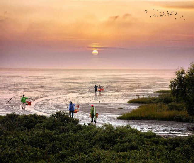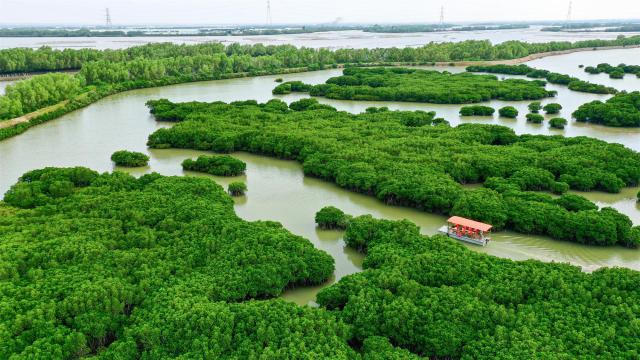 在湛江金牛岛,成片的红树林就像散落在浅海中的绿色岛屿。从北方移动的候鸟在这里找到了一个舒适的新家。