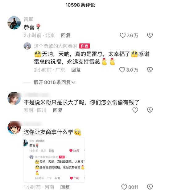 这位网友在网上分享:“雷总,钻石版小米 15 用了之后,男朋友特意抢了我求婚。米粉长大了,很开心。“雷军后来在评论区发了一条信息祝贺,并附上了一朵花。求婚的网友也很激动:“天啊,天啊,真的是雷总。我太高兴了。感谢雷总的祝福,我将永远支持雷总。”