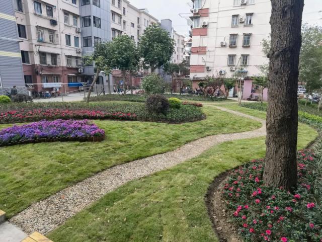 一个多月过去了,简单优雅的亭子终于恢复了工作。深柚色的柱子和横梁交织着古典的美感,坚固耐用的钢筋结构保证了亭子的稳定性。亭子西边,河卵石做的健身步道蜿蜒嵌在绿化中。小路两旁,绿树成荫,鲜花盛开,各种花草交错排列,形成理想的“小路花园”。