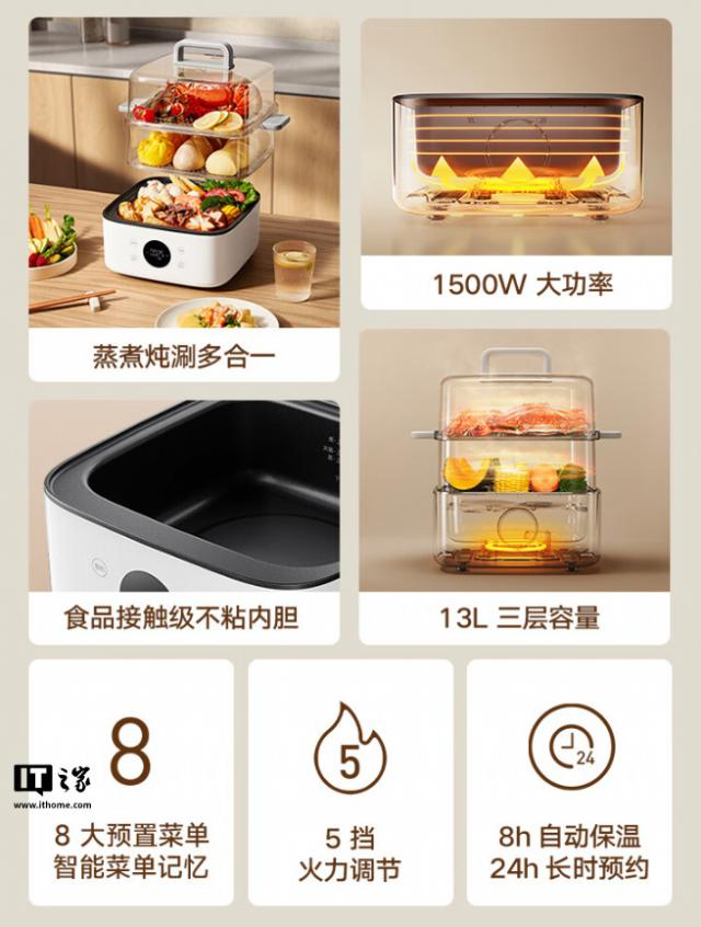 小米推出米家多功能电蒸锅 N1:13L 三层容量,199 元