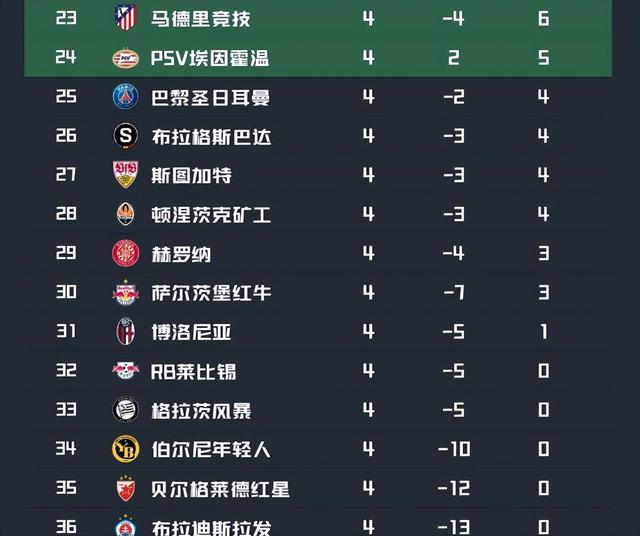 有些人高兴,有些人担心,同样是法甲球队的大巴黎表现非常糟糕,本轮巴黎在主场被马竞杀死,4 轮回之后只拿到 4 分数,排名直接下降到第一位。 25 位置,甚至连附加赛的位置都没有。拜仁这一轮的其他豪门球队中, 1 球小胜本菲卡,现在已经升至第一。 17;皇家马德里本轮败给 AC 米兰排在第 18,米兰第 20。尤文排在第 亚特兰大在第11名 它们就像国际米兰一样,是唯一的。 2 一支没有失球的球队。