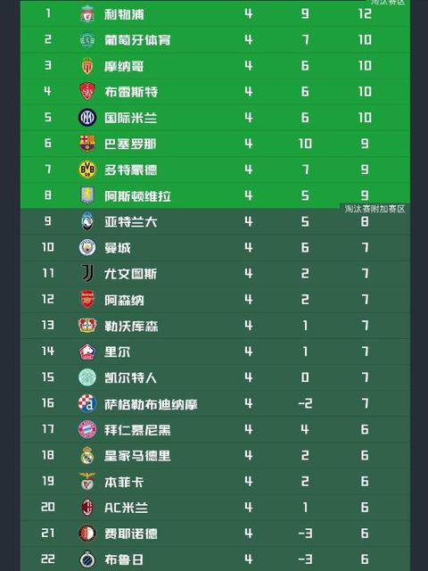 北京时间 11 月 7 一天早上,欧冠第一 4 轮子的所有比赛都结束了;在最新的积分榜上,利物浦成为唯一的全胜球队;大巴黎成为法甲表现最差的球队,但布雷斯特和摩纳哥冲进了前四;国际米兰和巴萨都连续赢得了晋升区;此外,还有 5 一支球队彻底输了。