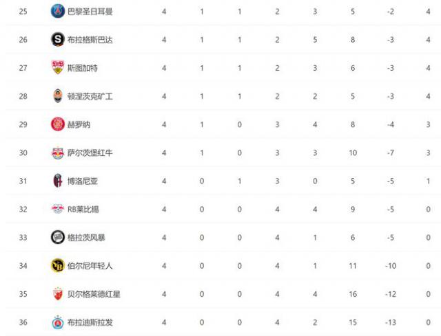 巴黎是最新的积分榜 4 轮只有 4 个别积分,排名已跌至第一。 25 只有排在前面的位置 24 球队可以出线,前面的球队, 8 位置直达十六强,第一 9 位到第 24 参加附加赛,第一名 25 位到第 36 位置被直接淘汰。