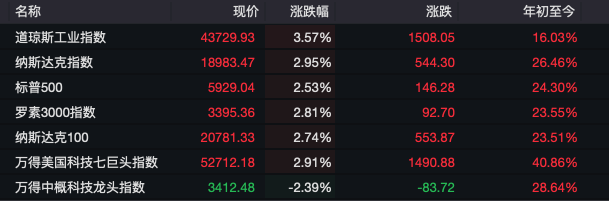 道琼斯工业指数飙升1508.05点, 收于43729.93点,涨幅为3.57%。2022年,上一次单日涨幅超过1000点。