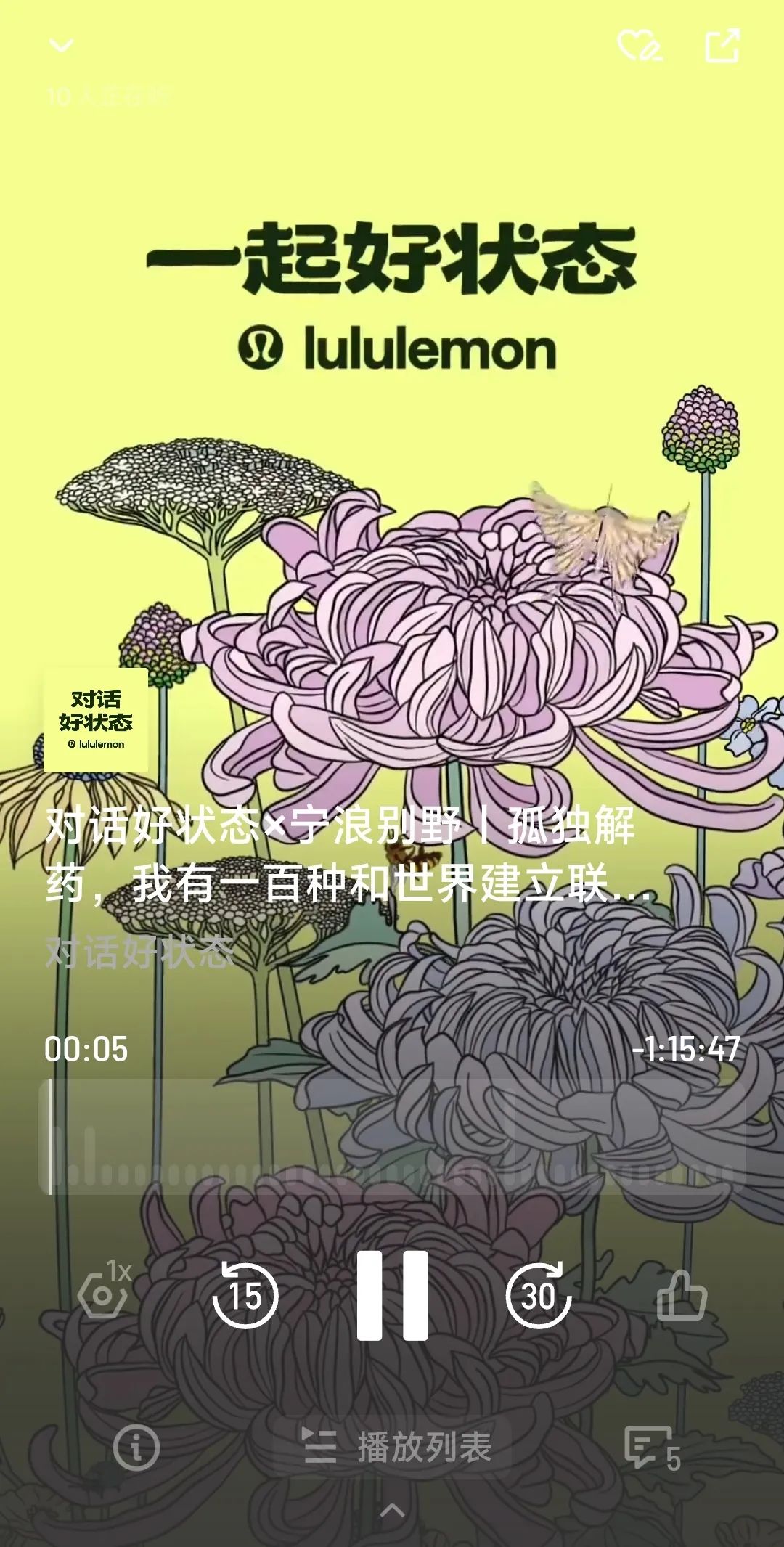 播客可以扩大品牌线下活动的传播效果,让对话碰撞出的火花常在。lululemon在10月上线的「对话好状态」中,首次尝试将线下对谈内容搬运至播客平台,此外还与四档头部播客联合推出定制内容。不同类型的表达者,从自身经验、解读《幸福感报告》、公共艺术等不同维度,为听众打开”何为好状态和幸福感“的思路,并定制专属播放界面,直观打造生机勃勃的收听体验,吸引潜在消费者。