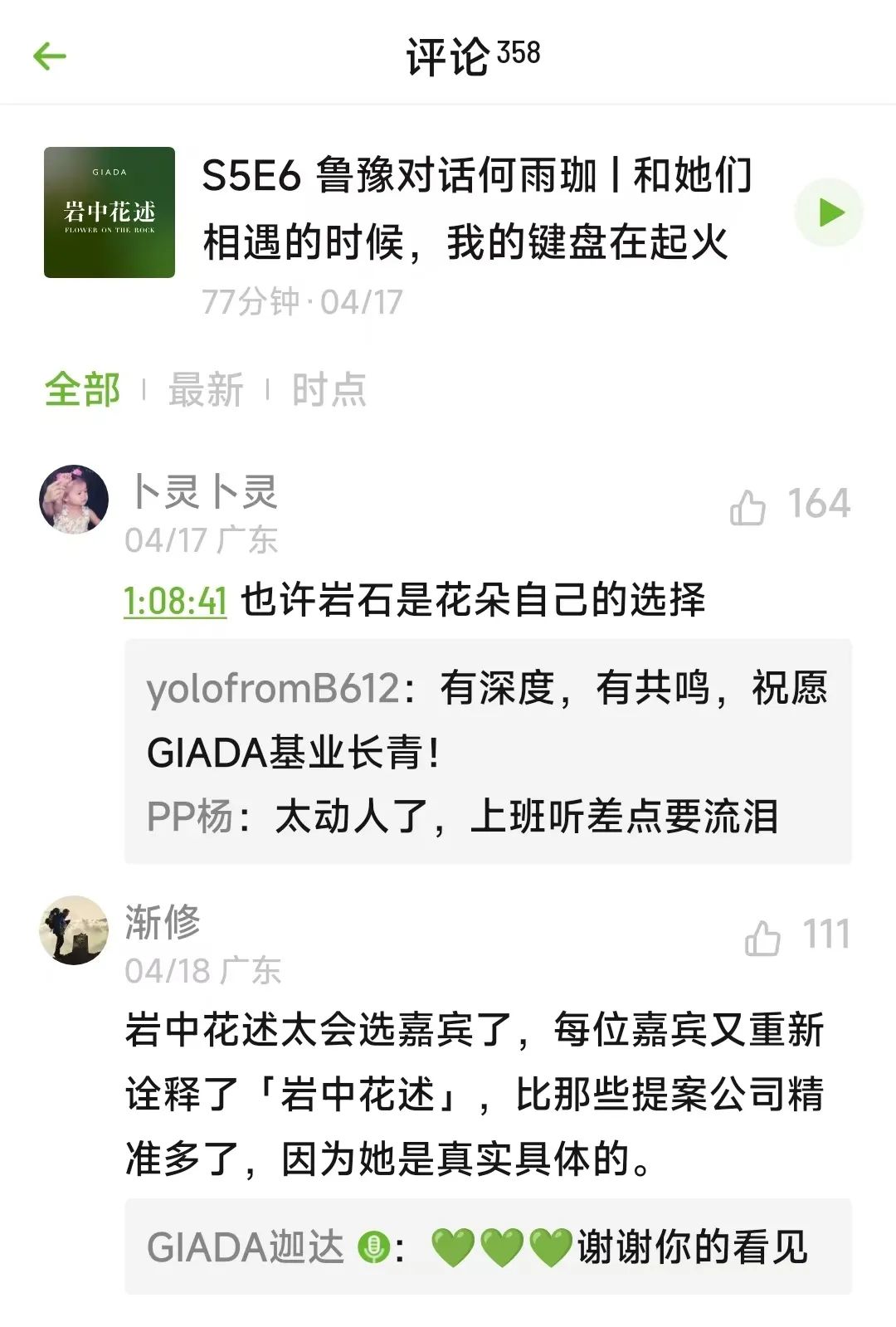 播客不是单方面输出,而是创作者与品牌的共创。比如在GIADA出品的「岩中花述」,在主持人鲁豫与嘉宾的对谈中,长时间的对话交流为听众带来深度的情绪共振,也在一次次以不同维度重新诠释“岩中花述”。“保住狗命,无所畏惧“,我一定要在乎我的感受,痛苦不能去比较“,“也许岩石是花朵自己的选择”……不同嘉宾的表达为品牌主张赋予了更深刻的意涵,凸显在行业内的卓越不群之处。