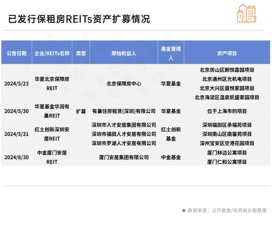 一类为“扩募类”,已经上市的6单保租房REITs中,已有4只基金申请扩募。,REIT分别是华夏北京保障房。、华夏华润有巢REIT、深圳红土创新安居REIT和中金厦门安居REIT,其底层资产仍然主要位于一线城市。