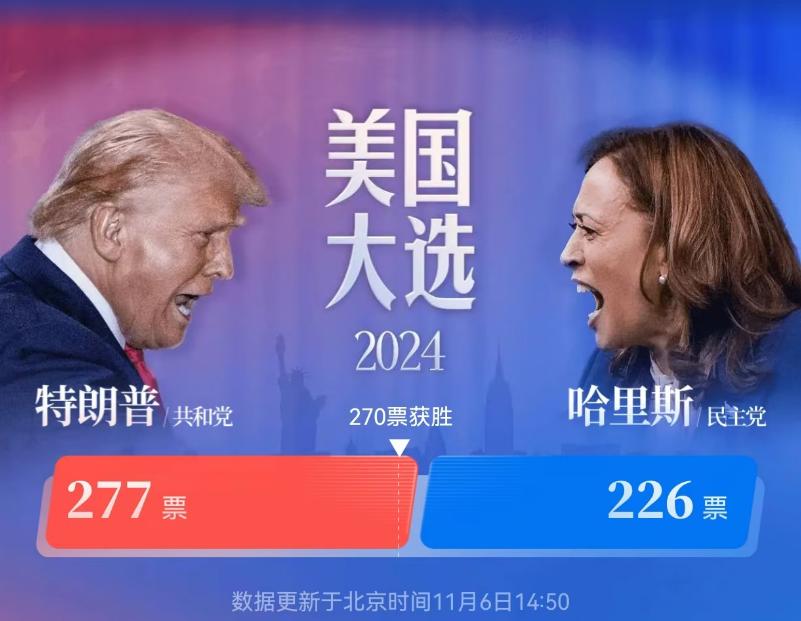 六日下午,根据美国大选的即时结果,特朗普以更大的优势再次当选美国总统,他的第二个任期即将开始。