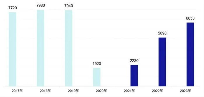 特朗普下台后,拜登担任美国总统。美国的国际游客数量从低谷迅速反弹。2023年达到6650人,但仍未回到2019年的水平。