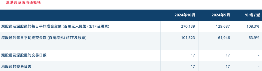 同样,今年10月,沪股通和深股通的日均成交额(ETF和股票)为2701.39亿元,同比增长108.3%。;每日成交额(ETF和股票)为1015.23亿港元,同比增长63.9%。事实上,2024年10月8日,港股成交额创下6207亿港元历史新高。与此同一天,沪深港通朝北和朝南的交易额分别创下了5101亿人民币和2803亿港元的历史新高。