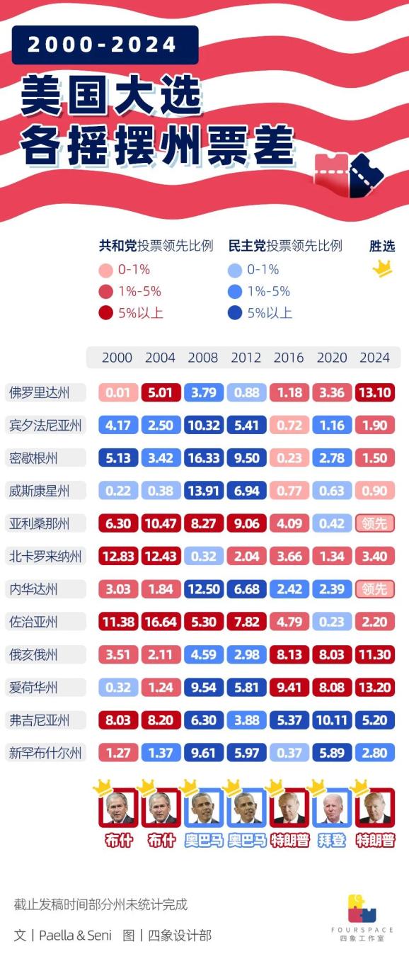 一般来说,摇摆州民主党和共和党的选票差别不会超过5%,所以每次选举的摇摆州都不完全一样,这也使得选举结果不可预测。