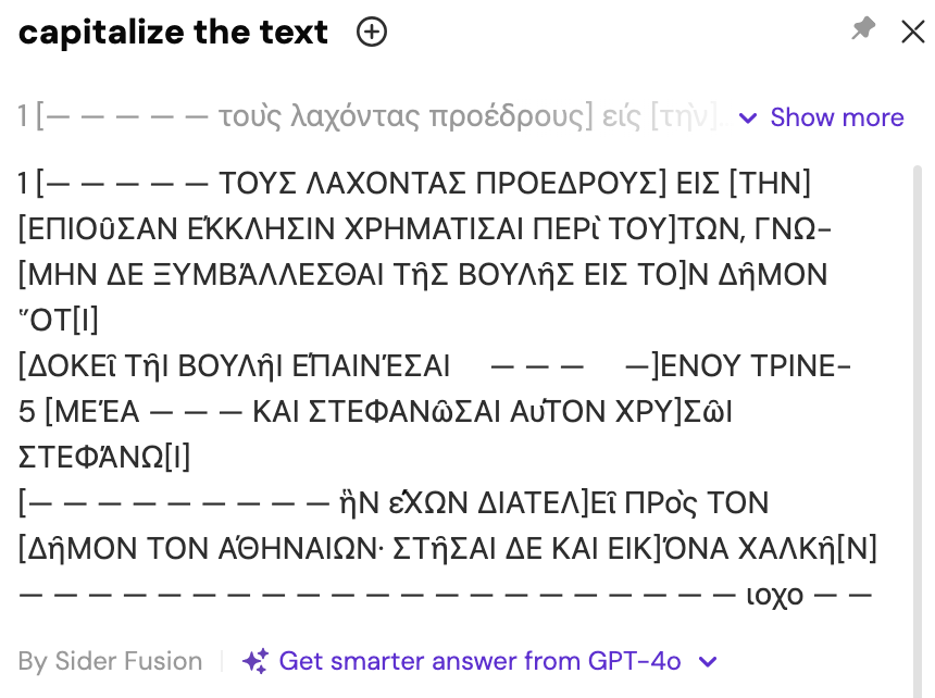 遗憾的是,在碑铭训练中使用免费AI,大小写的转换并不尽如人意。当我们要求Sider将希腊小写文本转换成希腊大写字母时,结果出现了。ΗΩ等待字母转换错误和局部失败。而且,承载铭文的石碑本身所具有的物质属性和字母形式是AI转换文本所不能呈现的。所以,在碑铭学课程中,使用传统照片进行转写训练更可靠。