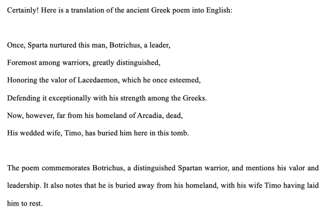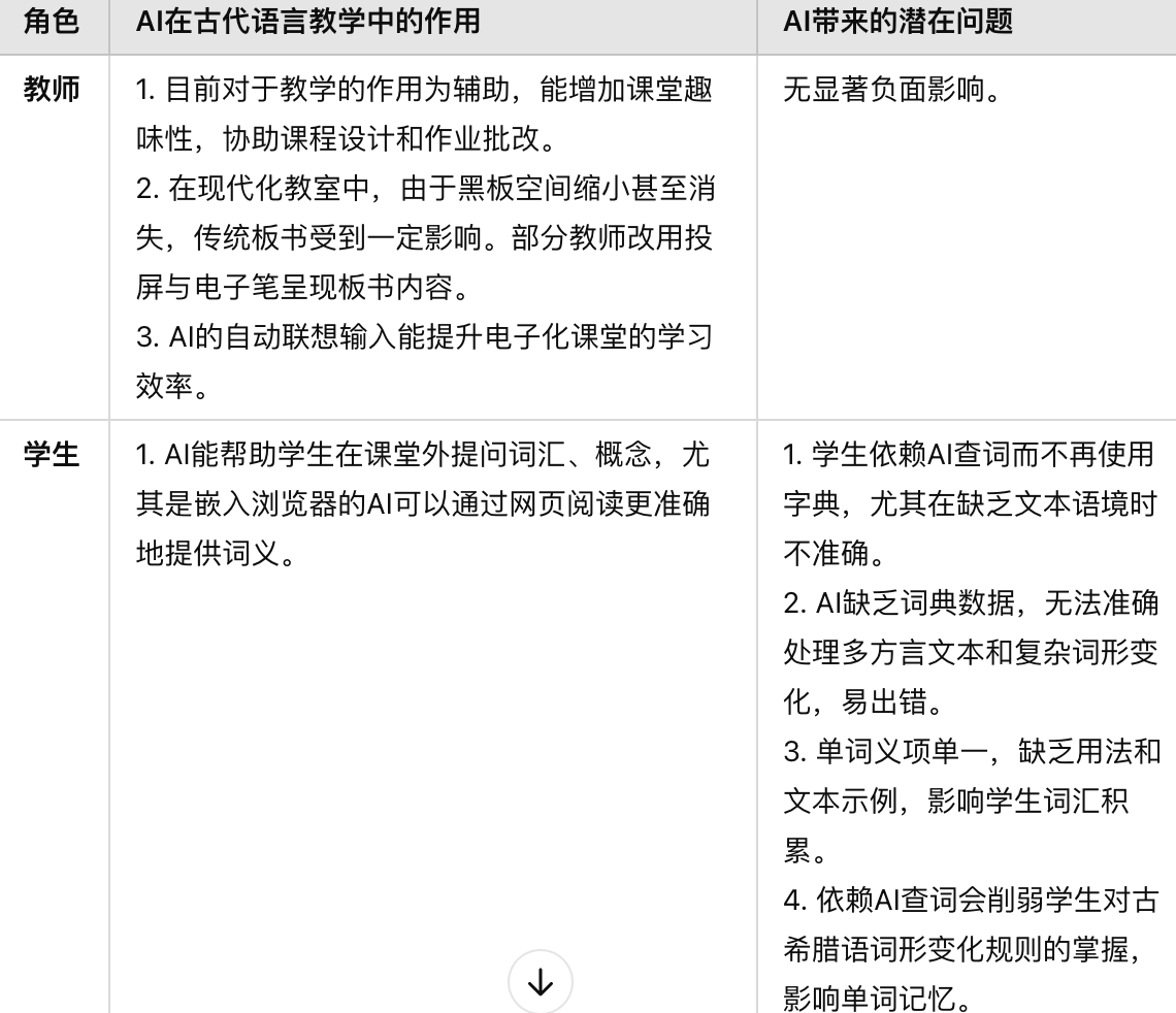 对于学生来说,目前AI的弊端也不容忽视。很多学生在问AI单词的意思之后就不再翻字典了。使用AI来检查文本情境缺失时的单词暂时是不可取的。但是,最近嵌入浏览器的AI可以更好地解决这个问题,通过阅读网页内容可以更准确地提供单词的含义。第一,由于缺乏字典数据的支持,许多AI仍然不足以支持阅读各种诗歌文本。对复杂的多方言文本而言,AI无法准确识别难度较大的词形变化,常常给出错误的词义。第二,AI给出的单词义项比较简单,而且缺乏常用的用法和文字的展示,这对学生的词汇积累非常不利。同时,询问AI单词的含义,使学生不再考虑古希腊语词形变化的规则。如果不要求AI提供古希腊语的词汇原型,学生就会失去记忆单词的机会。