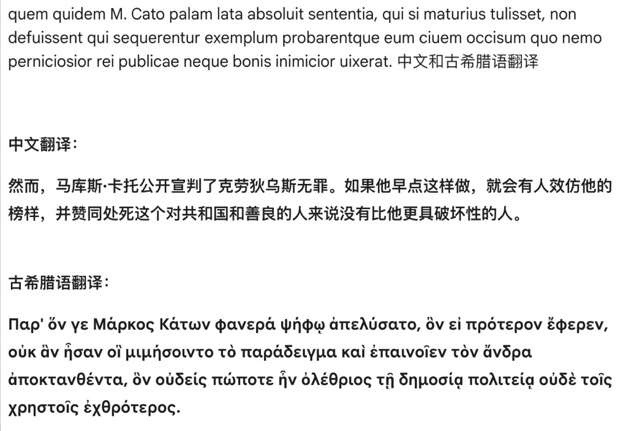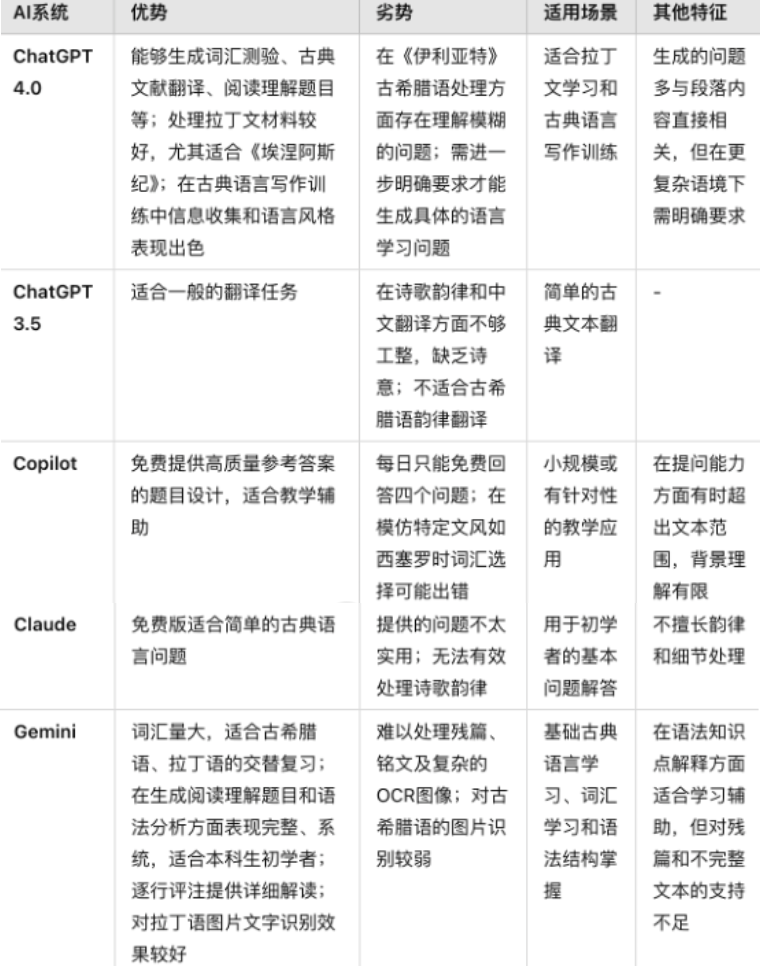 目前,一些国内大学不能同时开设古希腊语和拉丁语课程,学生可能没有足够的时间和精力同时参加两门语言课程。Gemini等AI可以帮助古希腊语和拉丁语的替代复习,面对学过其中一门语言但需要保持熟练程度的学生。