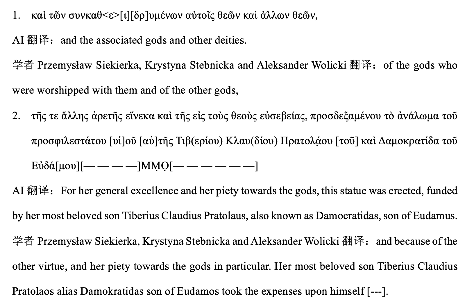 碑文具有高度程式化的表达,AI处理相对简单的殡葬符文和荣誉铭文基本不在话下,但面对复杂的法令符文,尤其是残篇,其翻译表现需要加强。现在国内古代史教学中,仍有少数高校有条件设立碑铭学课程和培训。很多学生基本上不会尝试探索和使用没有现代语言翻译的碑铭史料。但是如果没有古代语言的基础,学生也没有能力对AI进行翻译,在这种情况下,使用AI的符文翻译也是非常危险的。或许,目前AI翻译碑铭和纸草的能力可以为学生的论文写作增添一份史料脚注。