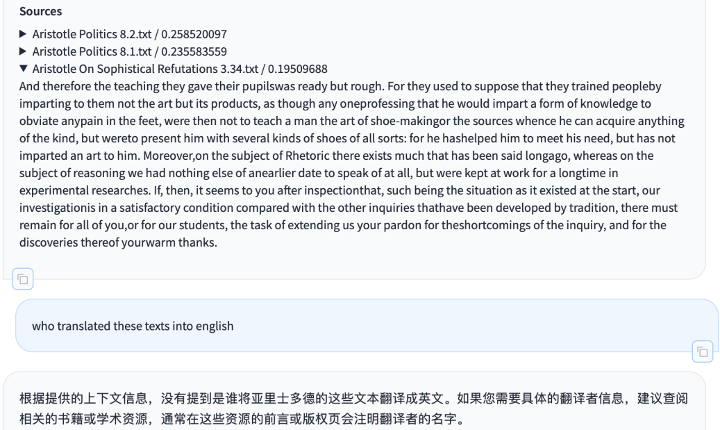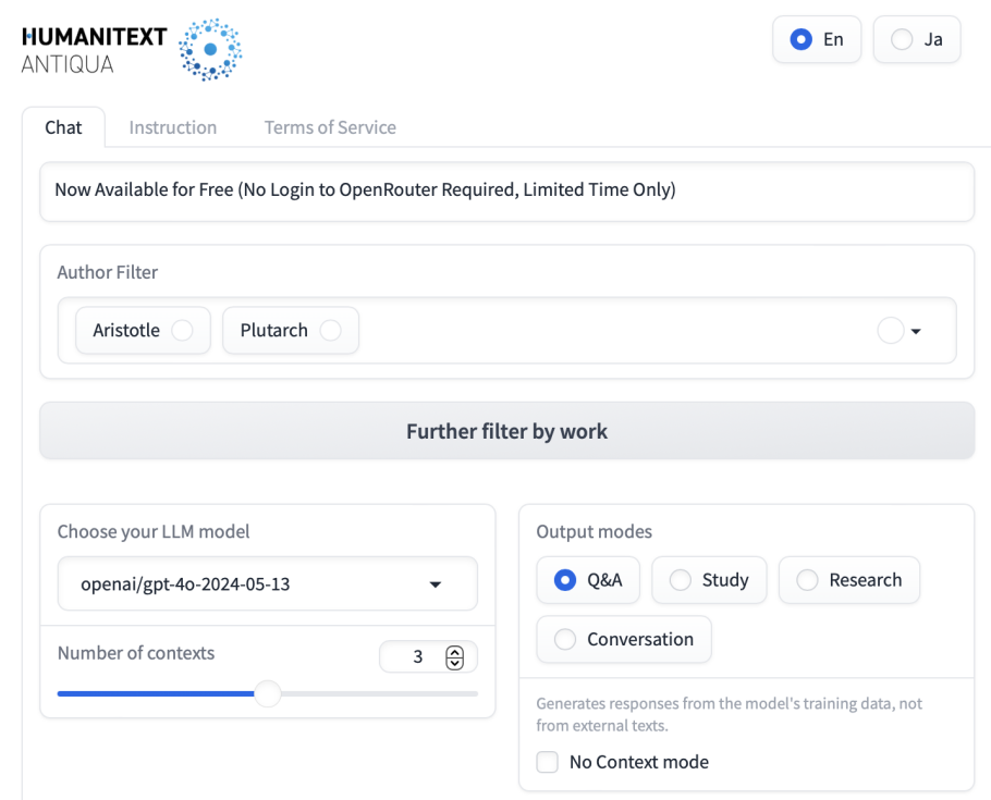 最近,日本学者推出了Humanitexte 新的Antiqua人工智能对话系统。该系统目前正处于实习阶段,可以免费提供客户体验。Humanitext Antiqua旨在为古典研究领域的学者和研究者提供不可或缺的辅助工具。截至目前,Humanitext Antiqua已经包含了22位西方古典作家的全集,总共有400篇左右的文字。平台覆盖的作者和作品数量仍在不断扩大。这个系统的乐趣在于让学者与古典文本交谈。借助强大的前后文搜索功能和基于对话的互动模式,用户可以直观地深入探索和分析古典文学作品。目前,R&D部门仍在努力进一步改进检索和增强生成(RAG)前后搜索功能的技术和准确性。然而,在实际试用过程中,使用中文提问给出的检索文献并不尽如人意,使用英文对话的结果更加令人印象深刻。虽然数据库给出了搜索史料的英文翻译,但并没有提供古希腊语的原文、版本和译者信息,所以只能在整理材料时提供参考,不能直接引用。