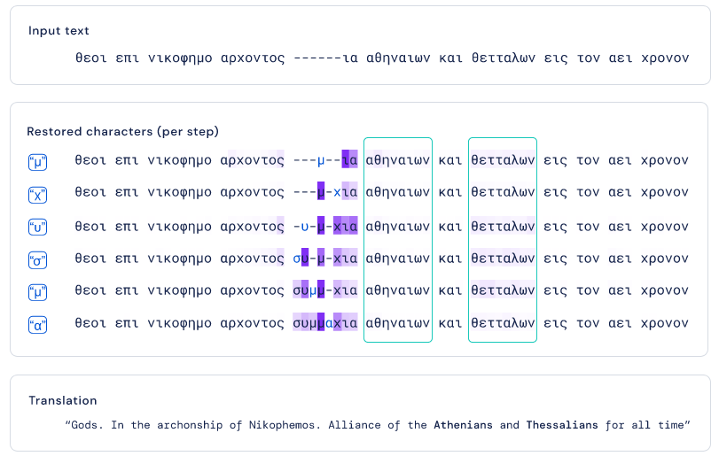 假设AI在碑铭翻译方面给研究带来了方便,可以提高初学者浏览和总结史料的速度。因此,DeepMind开发的Ithaca项目在破解和研究古希腊铭文方面更具革命性。早在2019年,Pythia就出现了一种古老的文本修复模式,它利用深度神经网络从损伤的文本输入中恢复缺失的字符,将最大的古希腊铭文库PHI转换为机器可操作的文本。(PHI-ML)。而且Ithaca项目不仅可以修复不完整的符文,而且可以为铭记的铭刻时间和位置提供参考。值得注意的是,Ithaca的输出结果并非单一答案,而是提供了多种概率,这为研究者提供了大量的参考和参考。