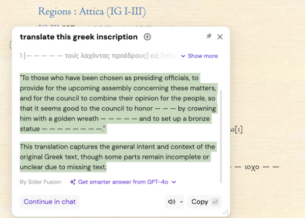 如果古典语言散文的翻译相对容易,格律诗词难度大,AI如何分析碑铭、纸草等残篇?AI似乎可以更快地处理希腊拉丁符文残篇,这是一个简单的、现代的语言翻译。您可以将Sider嵌入Chrome等浏览器中,从而打开铭文https。://epigraphy.packhum.org/等待站点后,用鼠标勾选文本,Sider可以立即打开铭文的翻译工作。