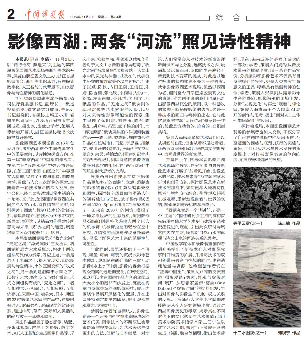 11月2日,以“二行诗河,照进来”为主题的第四届影像西湖艺术场景在浙江美术馆开幕。展览由浙江省文联、浙江省摄影家协会、浙江美术馆主办,旨在探索山水影像与诗意精神在数字化、人工智能背景下的演变与融合。