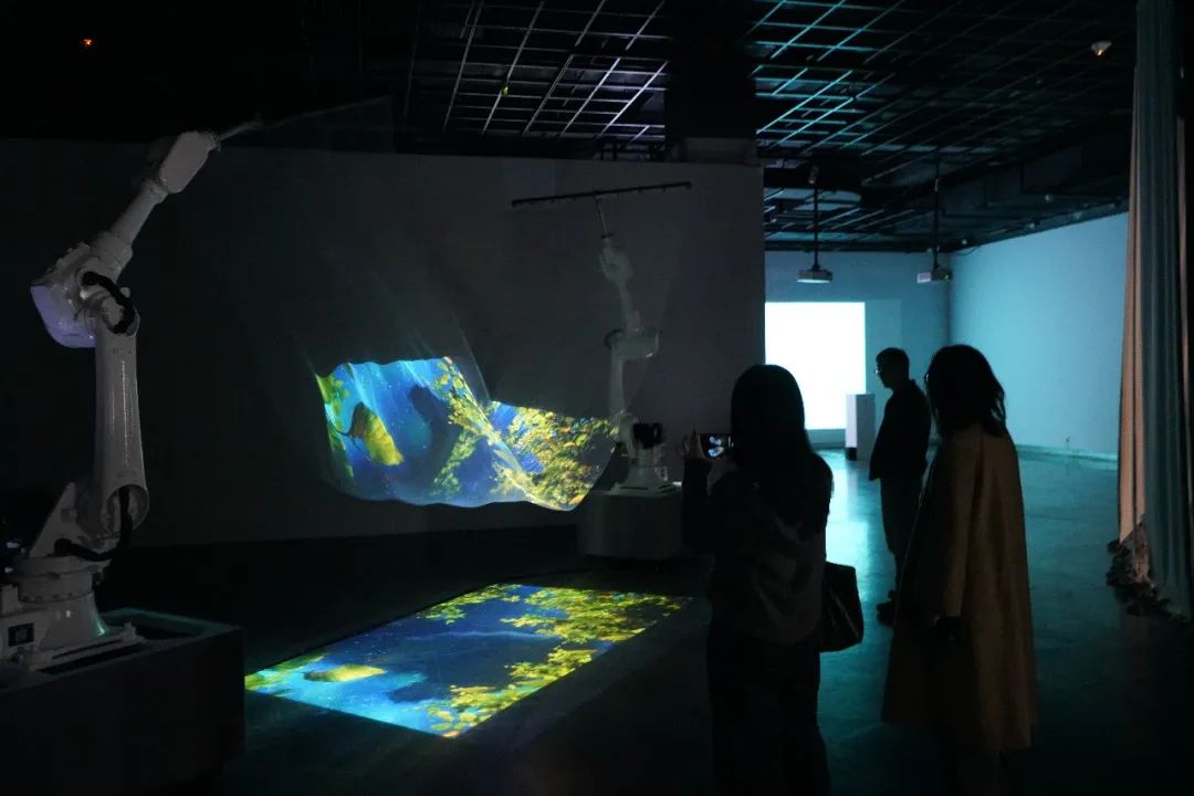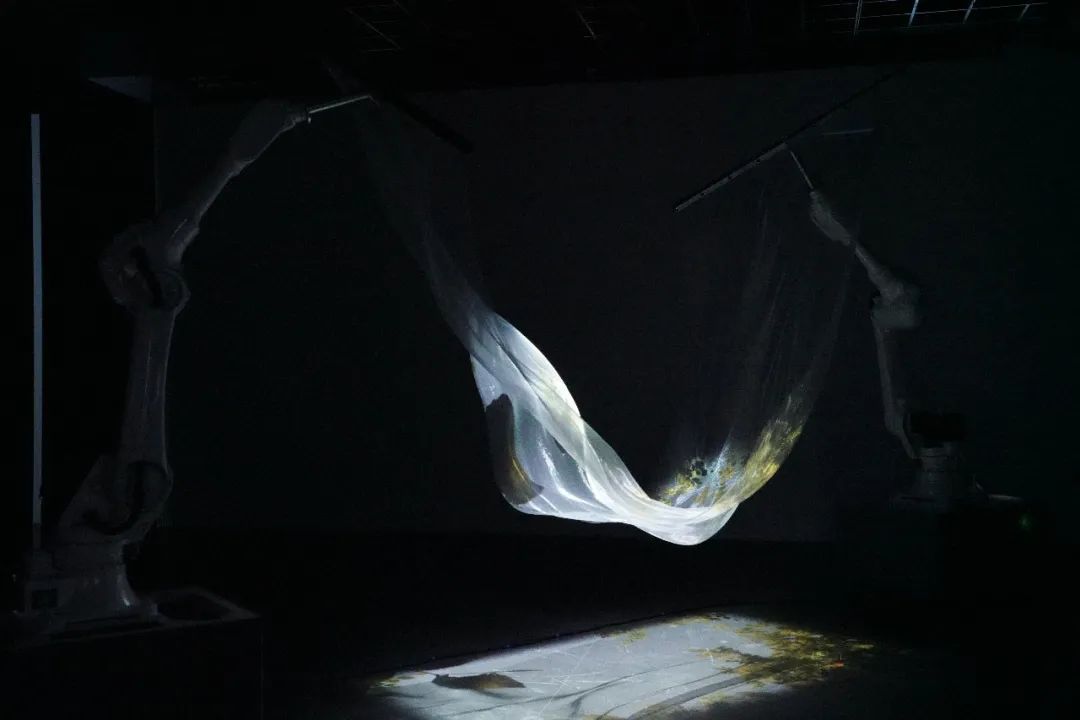 在新技术的加持下,展览突出了影像作品更加多样化的外观和构思。范献鑫的影像设备《假山》用算法编辑天空和花园,探讨数字风景如何塑造人们的视听感知和记忆。2030年,武子杨作品《巴石河2030-6plus》利用CG渲染,构建了一条来自2030年的河流,模拟了未来世界的生态危机。陈抱阳的作品《翩翩》将代码输入两个巨大的机械臂。机械臂拉动的纱布在空中摇曳,光影以精确的曲线和波纹支撑,呈现出丰富的图像艺术延展性和可塑性。
